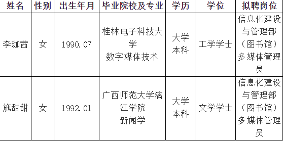 根據(jù)《廣西壯族自治區(qū)事業(yè)單位公開招聘人員實(shí)施辦法》(桂人社發(fā)〔2011〕155號)、《關(guān)于進(jìn)一步規(guī)范區(qū)直事業(yè)單位公開招聘工作的通知》(桂人社辦發(fā)〔2013〕135號)和《百色干部學(xué)院2020年第一輪公開招聘工作人員公告》的要求,我院2020年第一輪公開招聘工作人員工作嚴(yán)格按照公開招聘程序,通過發(fā)布公開招聘公告、網(wǎng)上報名、現(xiàn)場報到、資格審查、綜合能力應(yīng)用筆試、結(jié)構(gòu)化面試、考察等程序,經(jīng)院委會研究,擬錄用李珈茜、施甜甜同志到學(xué)院工作,F(xiàn)予以公示,公示期為7個工作日(2020年12月3日至12月11日)。對擬聘人員如有異議,請以書面形式,并署真實(shí)姓名、聯(lián)系地址和聯(lián)系方式,于2020年12月12日前郵寄或直接送達(dá)百色干部學(xué)院機(jī)關(guān)黨委(人力資源部)干部人事科(郵寄的以郵戳為準(zhǔn),直接送的以送達(dá)日期為準(zhǔn))。擬聘人員體檢合格且公示無異議后方可辦理聘用等相關(guān)手續(xù)。