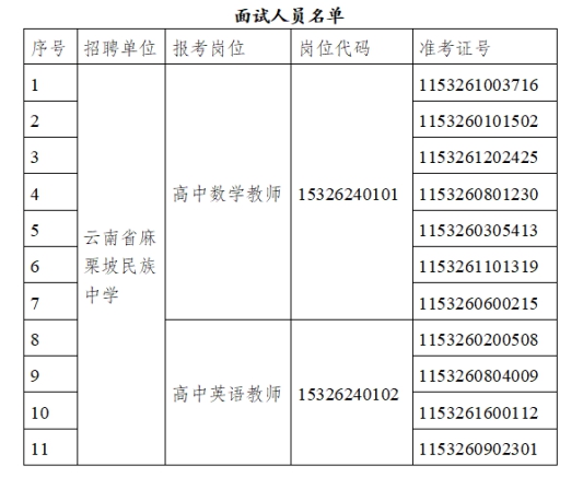 報考云南省麻栗坡民族中學(xué)高中數(shù)學(xué)教師(崗位代碼為15326240101)、高中英語教師(崗位代碼為15326240102)2個崗位,且經(jīng)過資格復(fù)審合格的人員,面試人員名單見附件。