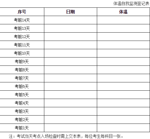 (二)本人在考前14天內(nèi)如實(shí)填寫“體溫自我監(jiān)測(cè)登記表”,體溫和個(gè)人健康情況均正常。