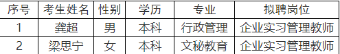 廣西工貿(mào)高級(jí)技工學(xué)校2020年公開(kāi)招聘工作人員筆試、面試、考核、體檢均已完成,根據(jù)《廣西工貿(mào)高級(jí)技工學(xué)校2020年公開(kāi)招聘工作人員公告》和事業(yè)單位公開(kāi)招聘工作人員的相關(guān)規(guī)定,經(jīng)學(xué)校黨總支委(擴(kuò)大)會(huì)議研究,決定擬聘用龔超等2名同志,現(xiàn)將擬聘用人員名單公示如下: