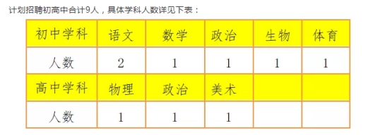 計(jì)劃招聘初高中合計(jì)9人,具體學(xué)科人數(shù)詳見(jiàn)下表: