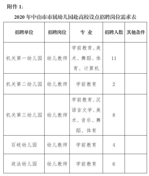 1.2020年中山市市屬幼兒園赴高校設(shè)點招聘崗位需求表
