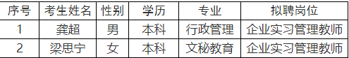 廣西工貿(mào)高級技工學校2020年公開招聘工作人員筆試、面試、考核、體檢均已完成,根據(jù)《廣西工貿(mào)高級技工學校2020年公開招聘工作人員公告》和事業(yè)單位公開招聘工作人員的相關(guān)規(guī)定,經(jīng)學校黨總支委(擴大)會議研究,決定擬聘用龔超等2名同志,現(xiàn)將擬聘用人員名單公示如下: