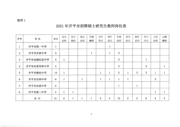 2021年開平市教育系統(tǒng)招聘語文、數(shù)學(xué)、英語、日語、政治、物理、生物、歷史、地理、體育、音樂、心理健康教育等學(xué)科碩士研究生教師共44人。詳細(xì)見:附件1《2021年開平市招聘碩士研究生教師崗位表》。