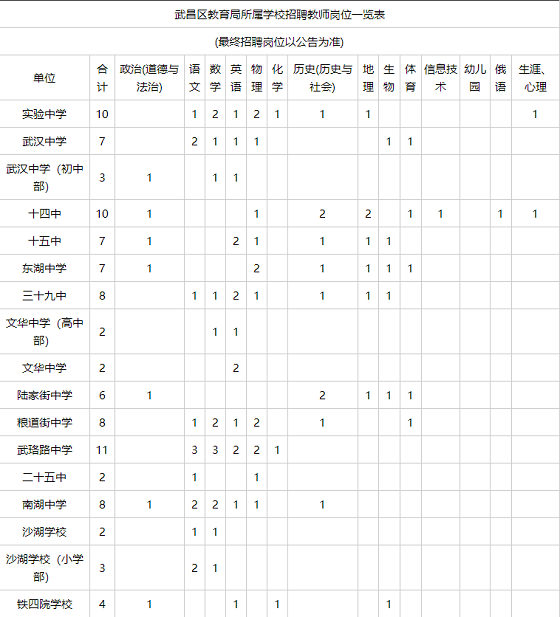 武昌區(qū)教育局所屬學(xué)校招聘教師崗位一覽表(最終招聘崗位以公告為準(zhǔn))