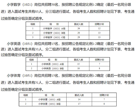 其中,C類(5001)崗位、小學(xué)語文(1011)崗位、小學(xué)數(shù)學(xué)(1021)崗位、小學(xué)英語(1031)崗位、小學(xué)體育(1051)崗位、初中語文(2011)崗位、初中數(shù)學(xué)(2021)崗位面試須分組進(jìn)行,具體分組及招聘方式如下: