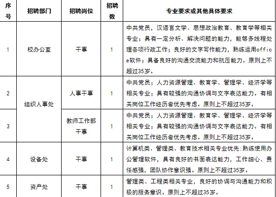 根據(jù)工作需要,擬向校外公開招聘5名行政教輔崗位工作人員。應(yīng)聘人員實(shí)行人才派遣制度。招聘崗位及應(yīng)聘條件如下: