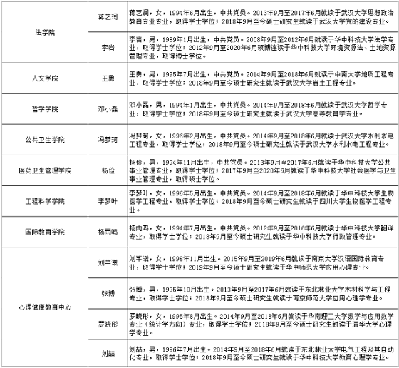 根據(jù)華中科技大學(xué)2021年度公開招聘專職輔導(dǎo)員、心理健康教育專職人員啟事,經(jīng)個人報名、資格審查、筆試、面試和用人單位考察等程序,確定季鑾雪等34人為擬錄人選,現(xiàn)予以公示。公示期間,如對公示對象有異議,請向我單位反映。