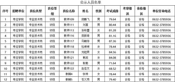 根據(jù)《關(guān)于2020年省屬事業(yè)單位公開招聘工作人員有關(guān)問題的通知》(魯人社發(fā)〔2019〕44號)等相關(guān)規(guī)定,按照崗位招聘計劃,棗莊學(xué)院組織完成了公開招聘考試、考察、體檢等工作,將對擬聘用人員進(jìn)行分批公示,現(xiàn)將第一批擬聘用人員名單公示如下。公示期為7個工作日,自2021年1月11日至2021年1月19日(不含節(jié)假日)。公示期間,如對公示人選有異議,請及時向省事業(yè)單位公開招聘主管機(jī)關(guān)和棗莊學(xué)院反映。