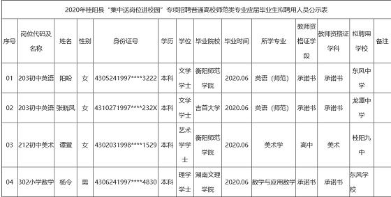 附表:2020年桂陽(yáng)縣“集中送崗位進(jìn)校園”專項(xiàng)招聘普通高校師范類專業(yè)應(yīng)屆畢業(yè)生遞補(bǔ)人員擬聘用公示表