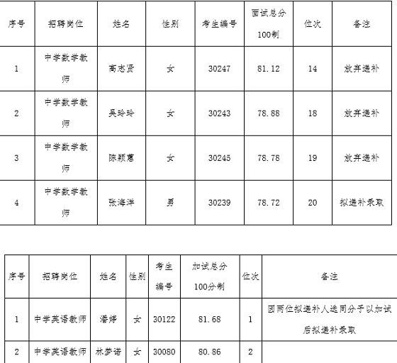 現(xiàn)將研究生及部屬公費師范生專場招聘會擬第三次遞補聘用人員名單公布如下請擬聘人員參照《福州市教育局關(guān)于研究生及部屬公費師范生專場招聘會擬聘人員簽訂就業(yè)協(xié)議等有關(guān)事項的通知》http://jyj.fuzhou.gov.cn/zz/zwgk/tzgg_47610/202012/t20201228_3917219.htm要求簽訂就業(yè)協(xié)議并參加統(tǒng)一體檢。