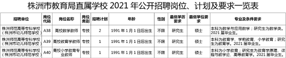 株洲市教育局發(fā)布2021年公開招聘教育人才公告,根據(jù)株洲師范高等專科學(xué)校事業(yè)發(fā)展及教育教學(xué)工作需要,我,F(xiàn)面向2021屆高校畢業(yè)生公開招聘4名優(yōu)秀教師。