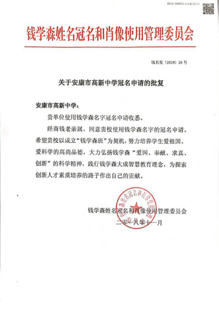 學(xué)校從2013年建校至今在青少年素質(zhì)教育方面的探索和實踐以及優(yōu)異的中高考成績得到了我國科學(xué)屆泰斗錢學(xué)森先生之子錢永剛教授的高度肯定。2018年,錢學(xué)森姓名冠名和肖像使用管理委員會將橄欖枝拋向了高新中學(xué)!板X學(xué)森班”是秉承探索培養(yǎng)富有愛國情懷和創(chuàng)新能力人才使命的一種育人模式,在全國范圍內(nèi)選擇教學(xué)質(zhì)量、生源質(zhì)量優(yōu)質(zhì)的高中或大學(xué)設(shè)立。安康市高新中學(xué)已于2018年11月正式獲得“錢學(xué)森班”設(shè)立批復(fù),并正式組建”錢學(xué)森班”,這也是繼西安高新一中后,陜西省第二個中學(xué)生“錢學(xué)森班”,全國范圍內(nèi)的第50個“錢學(xué)森班”。