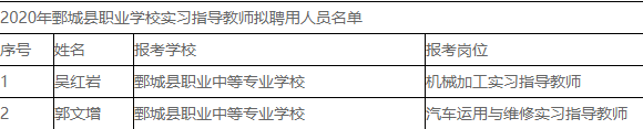 根據(jù)《2020年鄄城縣職業(yè)學(xué)校實(shí)習(xí)指導(dǎo)教師招聘公告》規(guī)定,經(jīng)過面試、體檢、考察,現(xiàn)將擬聘用人員名單予以公示。