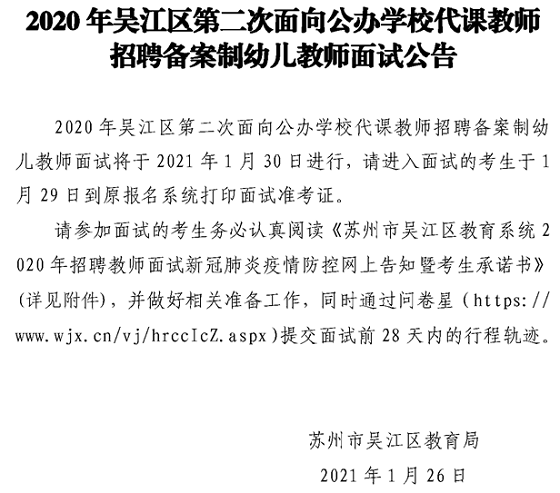 2020年江蘇省蘇州吳江區(qū)第二次面向公辦學(xué)校代課教師招聘備案制幼兒教師面試公告