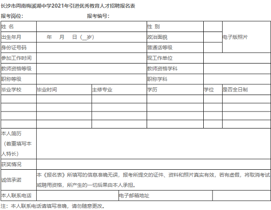 附:《長沙市周南梅溪湖中學(xué)2021年引進(jìn)優(yōu)秀教育人才招聘報(bào)名表》