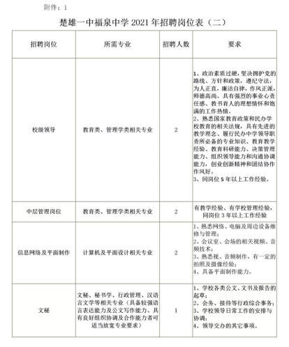 附件:1.楚雄一中福泉中學(xué)2021年招聘崗位表(二)
