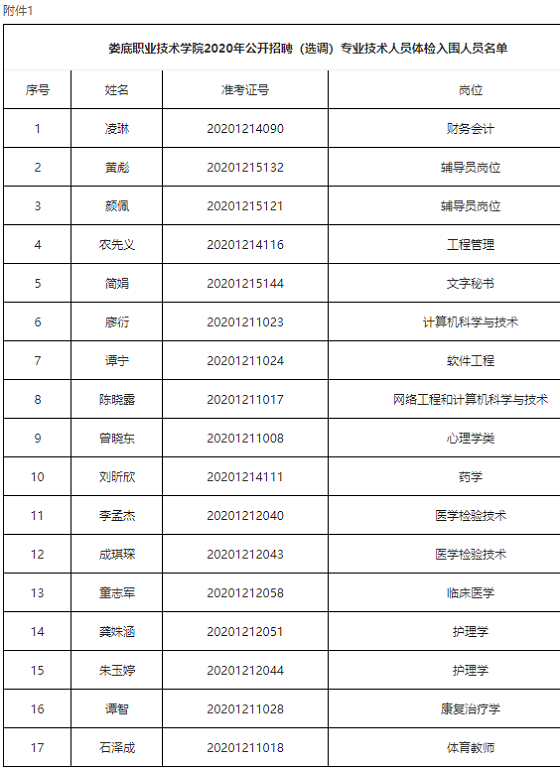 附件:1.婁底職業(yè)技術(shù)學(xué)院2020年公開招聘(選調(diào))專業(yè)技術(shù)人員體檢人員名單