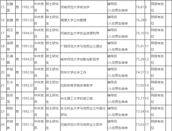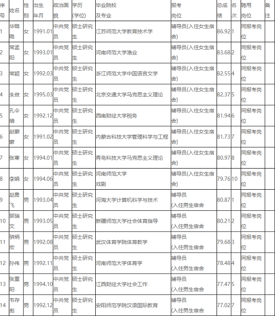 按照省教育廳、省人社廳審核備案的《安陽師范學(xué)院2020年公開招聘輔導(dǎo)員方案》有關(guān)要求,我校面向社會組織開展了2020年公開招聘工作,計(jì)劃公開招聘輔導(dǎo)員(碩士研究生)24名,通過報(bào)名、筆試、面試、體檢和考察等程序,共確定擬聘用人員24人(見附件),現(xiàn)予以公示。公示時(shí)間:2021年1月28日至2021年2月5日。