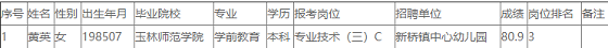 根據(jù)《福綿區(qū)2020年使用聘用教師控制數(shù)公開招聘中小學(xué)校幼兒園緊缺學(xué)科教師的公告》的規(guī)定,由于考生延緩體檢考察原因,經(jīng)過面試、體檢、考察等程序,擬聘用黃英同志為我區(qū)使用聘用教師控制數(shù)的幼兒園教師,現(xiàn)予以公示(詳見附表)。公示期為5個工作日(2021年2月3日至2月8日)。