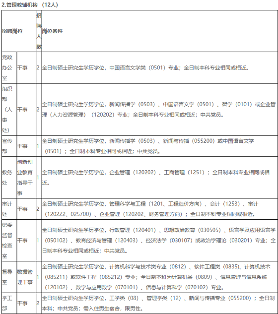 2.崗位條件中學科、專業(yè)后面括號內(nèi)數(shù)字為學科、專業(yè)代碼。報名人員請注意區(qū)分學碩和專碩代碼,不得報所學專業(yè)代碼與招考崗位專業(yè)代碼不一致的崗位。所學專業(yè)未列入專業(yè)目錄(沒有專業(yè)代碼)的,可選擇招