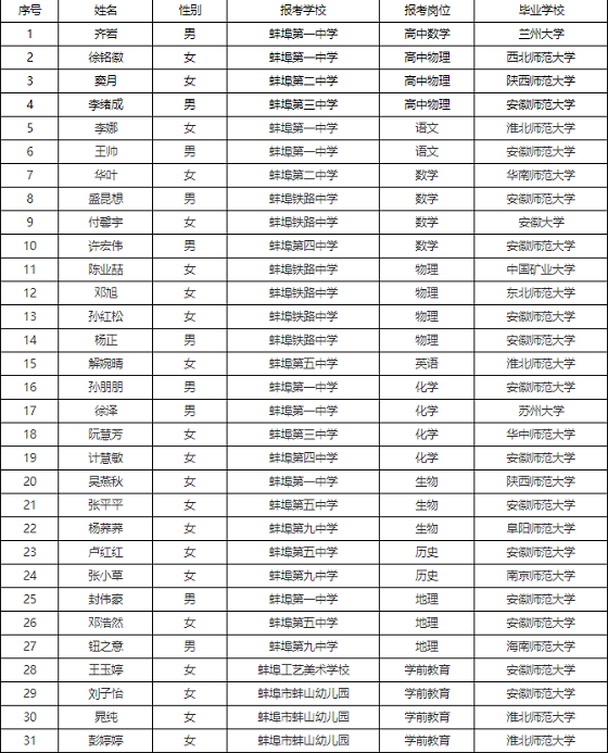 根據(jù)《蚌埠市教育局所屬學(xué)校2021屆緊缺專業(yè)人才“校園招聘”公告》和安徽省委組織部、安徽省人力資源和社會保障廳、安徽省衛(wèi)生廳《關(guān)于進一步規(guī)范全省事業(yè)單位公開招聘人員體檢工作的通知》(皖人社秘〔2013〕208號)等規(guī)定,蚌埠市教育局將組織2021屆緊缺專業(yè)人才“校園招聘”入圍人員的體檢,相關(guān)事宜通知如下: