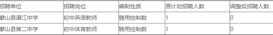 因部分崗位報名人數(shù)不達1:3的比例,需取消該崗位的招聘,現(xiàn)將《2021年蒙山縣第一次直接面試招聘事業(yè)單位工作人員簡章》的招聘計劃再次調(diào)整如下: