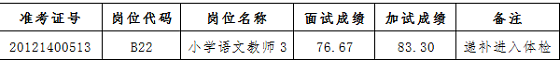 因部分考生放棄在我區(qū)的擇業(yè)資格,根據(jù)《無錫高新區(qū)(新吳區(qū))教育系統(tǒng)2021年校園招聘教師公告》規(guī)定,“根據(jù)面試成績從高到低的順序,按招聘崗位人數(shù)1:1的比例確定體檢人選并現(xiàn)場簽訂就業(yè)協(xié)議。面試成績相同時(shí),則進(jìn)行加試,以加試成績高者為先”,經(jīng)加試環(huán)節(jié),現(xiàn)有以下考生遞補(bǔ)進(jìn)入體檢環(huán)節(jié):