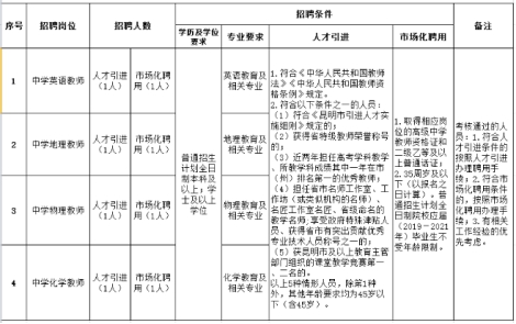 為加強(qiáng)學(xué)校教師隊(duì)伍建設(shè),引進(jìn)優(yōu)秀師資,進(jìn)一步滿足人民群眾對(duì)優(yōu)質(zhì)教育資源的需求,根據(jù)我校教育教學(xué)工作需要,面向社會(huì)引進(jìn)省內(nèi)、外優(yōu)秀中學(xué)教師共計(jì)4人(英語(yǔ)、地理、物理、化學(xué)教師各1人)、招聘市場(chǎng)化聘用教師4人(英語(yǔ)、地理、物理、化學(xué)教師各1人)。通過(guò)人才引進(jìn)的教師均解決編制;符合市場(chǎng)化聘用條件的,按照市場(chǎng)化聘用辦法辦理聘用手續(xù),F(xiàn)將有關(guān)事項(xiàng)公告如下: