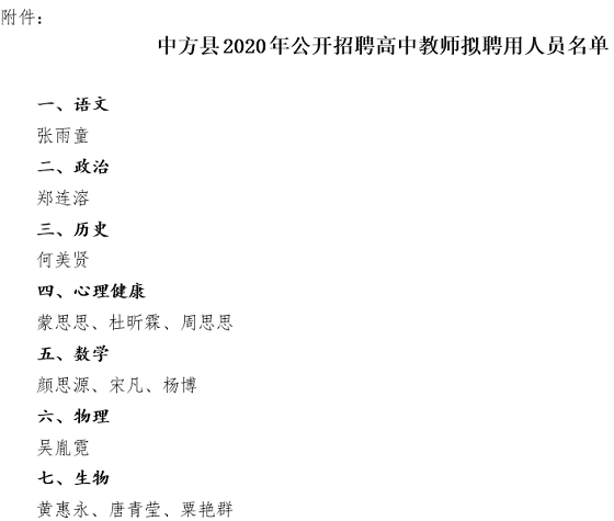 附件:中方縣2020年公開招聘高中教師擬聘用人員名單