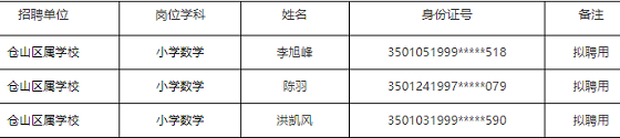 根據(jù)《福州市教育局關(guān)于舉辦2021屆公費(fèi)師范生專場(chǎng)雙選會(huì)的公告》,現(xiàn)將倉(cāng)山區(qū)本次雙選會(huì)擬聘用人員名單予以公示。