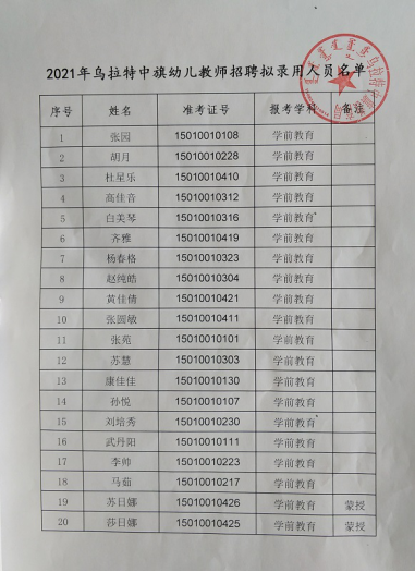 根據(jù)《烏拉特中旗幼兒教師招聘工作方案》,經(jīng)過(guò)嚴(yán)格的網(wǎng)上報(bào)名、資格初審、筆試、資格復(fù)審、面試、體檢、崗前培訓(xùn)等程序,確定張園等20名人選為擬錄用人員,現(xiàn)予以公示。