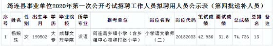 附:筠連縣事業(yè)單位2020年第一次公開(kāi)考試招聘工作人員擬聘用人員公示表(第四批遞補(bǔ)人員)