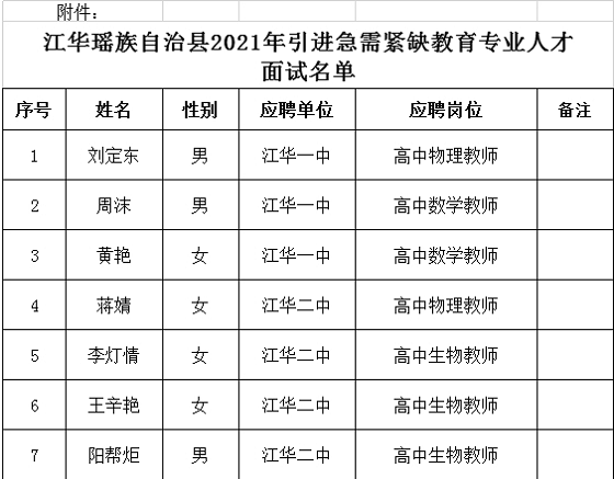 附件:江華瑤族自治縣2021年引進急需緊缺教育專業(yè)人才面試名單