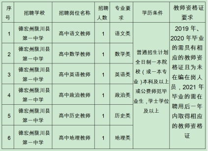 為進一步提高教育教學質量,加強教師隊伍建設,按照中共德宏州委機構編制委員會辦公室《關于同意2021年度隴川縣部分事業(yè)單位選優(yōu)的批復》文件要求,擬面向社會公開考核招聘緊缺專業(yè)學科優(yōu)秀人才6名,現(xiàn)將相關事宜公告如下: