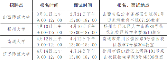 2021年3月下旬開始根據(jù)招聘崗位空缺情況依次到山西師范大學(xué)、揚(yáng)州大學(xué)、南通大學(xué)、江蘇師范大學(xué)四個招聘點(diǎn)分別舉行專場招聘會。應(yīng)聘人員現(xiàn)場報名、現(xiàn)場面試。