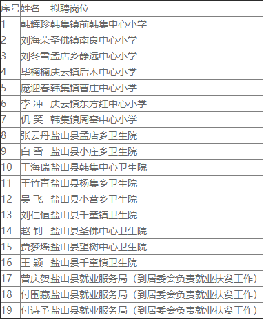 根據(jù)《鹽山縣專項(xiàng)招聘服務(wù)期滿“三支一扶”計(jì)劃志愿者招聘公告》,經(jīng)過資格審查、考試、體檢、考察等程序,韓輝珍等19人被確定為擬聘用人員(名單附后),F(xiàn)于2021年3月24日至4月1日進(jìn)行公示。公示期滿,如無異議,即辦理聘用手續(xù)。