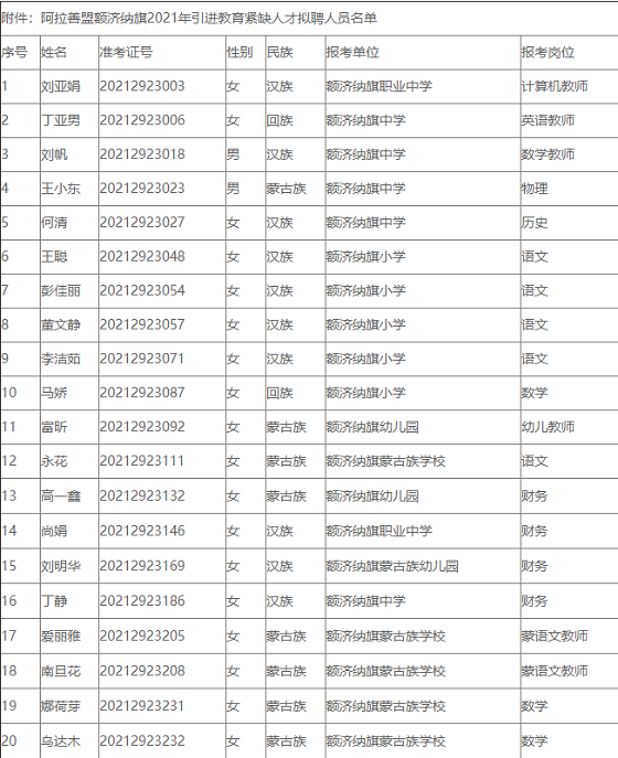額濟(jì)納旗2021年引進(jìn)教育緊缺人才已完成筆試、面試、體檢、考察等工作,按照《阿拉善盟額濟(jì)納旗2021年引進(jìn)教育緊缺人才公告》要求,現(xiàn)將擬錄用人員名單進(jìn)行公示(詳見(jiàn)附件),公示期自2021年3月24日—3月30日,共7天,公示期間如對(duì)擬聘用人員有異議,請(qǐng)反映相關(guān)情況。