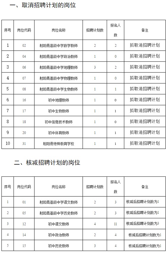 根據(jù)《2021年射陽縣教育局直屬部分學校公開招聘教師公告》精神和報名情況,經(jīng)射陽縣人力資源和社會保障局、射陽縣教育局會商研究,《2021年射陽縣教育局直屬部分學校公開招聘教師崗位表》中部分崗位因報名人數(shù)不足未達到開考條件,現(xiàn)對相應崗位招聘計劃予以取消和核減,具體崗位公示如下: