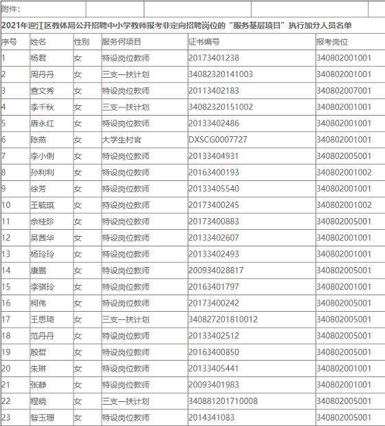 根據(jù)《2021年度安慶市迎江區(qū)新任教師公開招聘公告》要求,現(xiàn)將楊君等23名符合2021年迎江區(qū)教體局公開招聘中小學(xué)報(bào)考非定向招聘崗位的“服務(wù)基層項(xiàng)目”執(zhí)行加分人員的名單進(jìn)行公示。