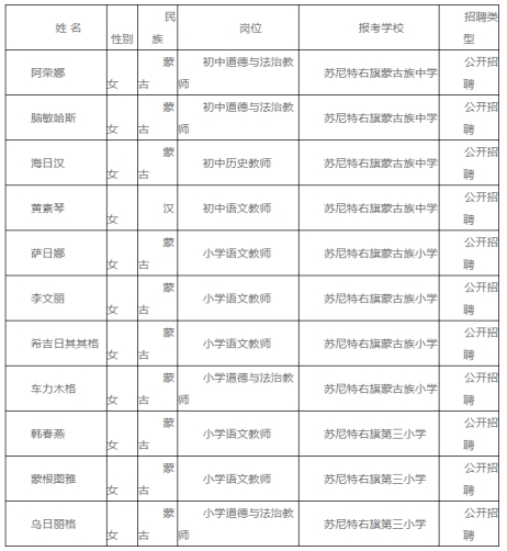 根據(jù)《錫林郭勒盟2021年度公開招聘義務(wù)教育階段民族語言授課學(xué)!叭啤苯y(tǒng)編教材教師實施方案》的規(guī)定,組織開展了義務(wù)教育民族語言授課學(xué)校“三科”統(tǒng)編教材教師公開招聘工作,經(jīng)網(wǎng)上報名、初試、面試、資格復(fù)審、體檢、考察等環(huán)節(jié),共有11人進入擬聘用范圍,現(xiàn)按招聘程序公示如下: