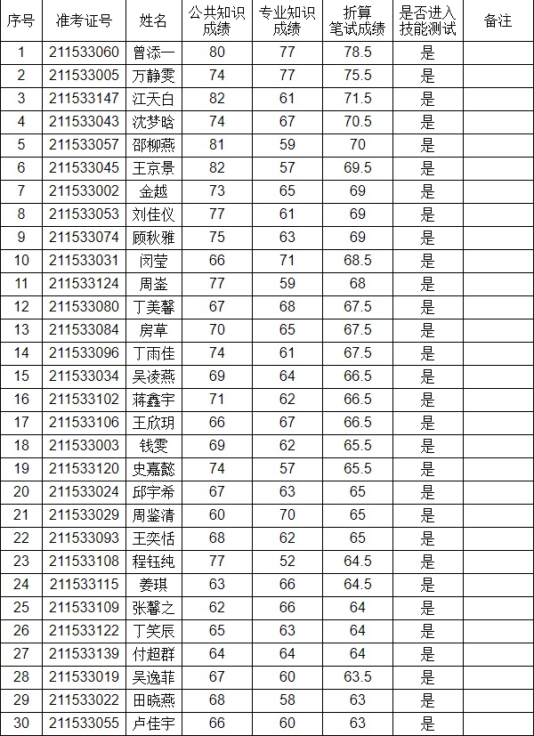 一、報(bào)考幼兒教師Y01崗位進(jìn)入技能測(cè)試名單及筆試成績(jī)(總計(jì)51人)