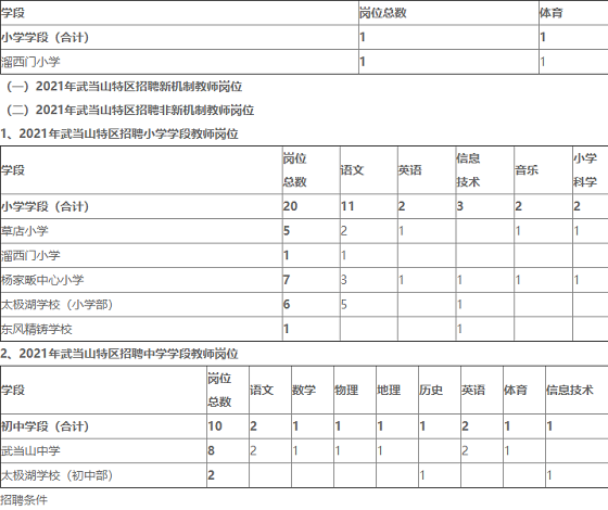 根據(jù)農(nóng)村學(xué)校編制、崗位空缺情況及教育教學(xué)需要,2021年武當(dāng)山特區(qū)面向社會公開招聘農(nóng)村義務(wù)教育學(xué)校新機(jī)制教師1名、非新機(jī)制教師30名,招聘崗位及數(shù)量情況如下: