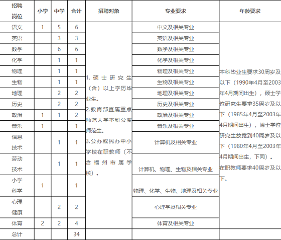本次計劃招聘編內(nèi)教師34名。具體如下: