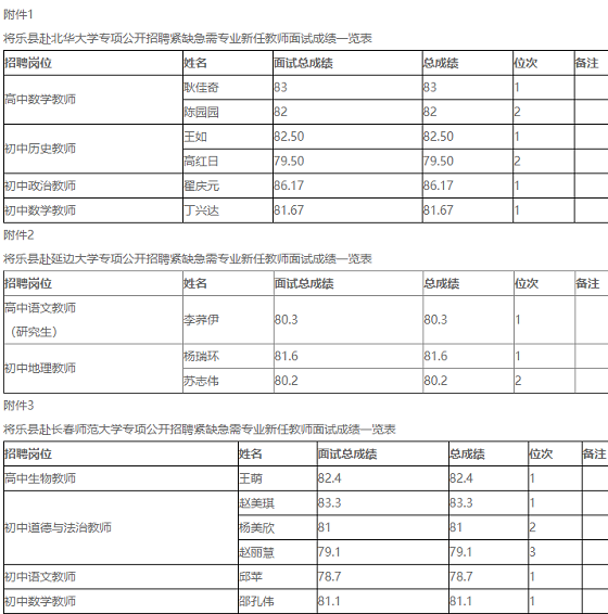 附件:1.將樂縣赴北華大學專項公開招聘緊缺急需專業(yè)新任教師面試成績一覽表