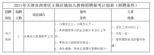 單位、崗位人數(shù)及資格條件等詳見附件1《天津市西青區(qū)王穩(wěn)莊鎮(zhèn)幼兒教師招聘計劃表》,應聘人員從2021年4月8日開始,可通過天津人才網(wǎng)(www.tjrenliziyuan.com)進行查詢。