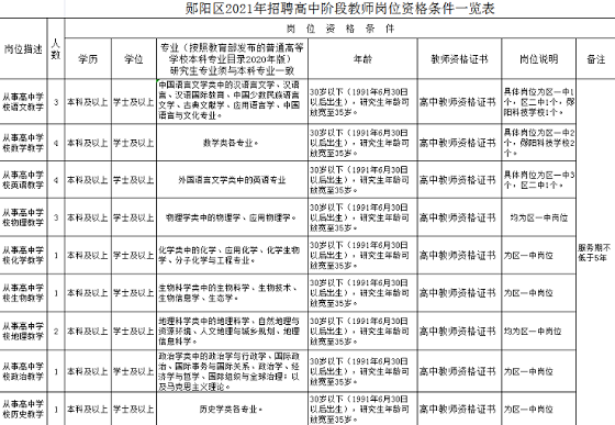 根據(jù)《事業(yè)單位人事管理?xiàng)l例》(國(guó)務(wù)院令第652號(hào))、《事業(yè)單位公開(kāi)招聘人員暫行規(guī)定》(人事部令第6號(hào))、《事業(yè)單位公開(kāi)招聘違紀(jì)違規(guī)行為處理規(guī)定》(人社部令第35號(hào))等文件精神,現(xiàn)將鄖陽(yáng)區(qū)2021年公開(kāi)招聘高中階段教師公告如下:
