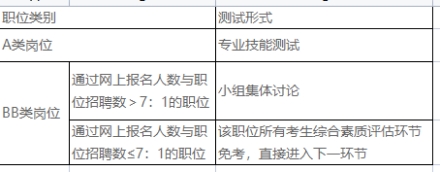 綜合素質(zhì)評(píng)估主要采取專(zhuān)業(yè)技能測(cè)試、小組集體討論等形式,對(duì)考生進(jìn)行考察。各崗位具體考核形式見(jiàn)下表。