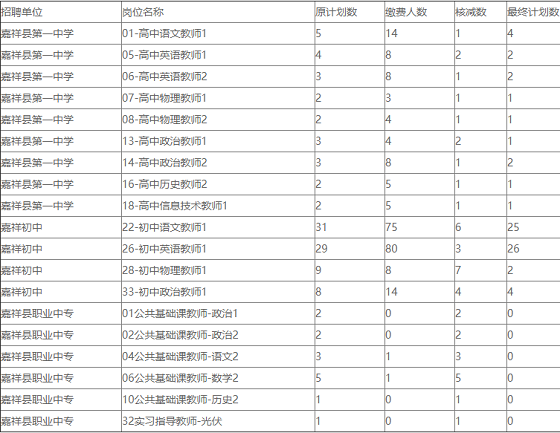 根據(jù)《2021年嘉祥縣事業(yè)單位公開招聘工作人員(教育類)簡章》、《2021年嘉祥縣事業(yè)單位公開招聘備案制工作人員(教育類)簡章》規(guī)定和應聘人員審核繳費情況,部分崗位通過資格初審的繳費人數(shù)未達到規(guī)定比例,其招聘計劃予以核減或取消,現(xiàn)將有關情況公告如下: