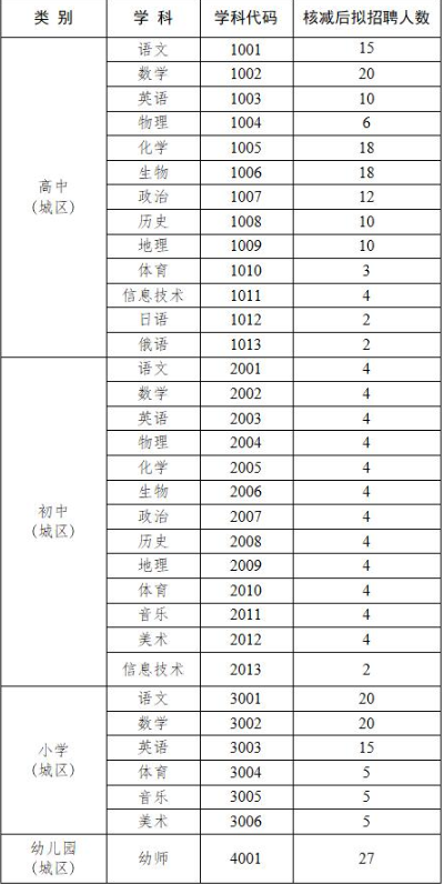 根據(jù)《永城市2021年公開(kāi)招聘教師公告》中:“報(bào)名結(jié)束后,高中教師招聘人數(shù)與報(bào)名人數(shù)須達(dá)到1:2,初中、小學(xué)、幼兒園教師招聘人數(shù)與報(bào)名人數(shù)須達(dá)到1:3,否則按比例核減招聘人數(shù)”的要求,F(xiàn)將核減后各學(xué)科擬招聘人數(shù)公告如下: